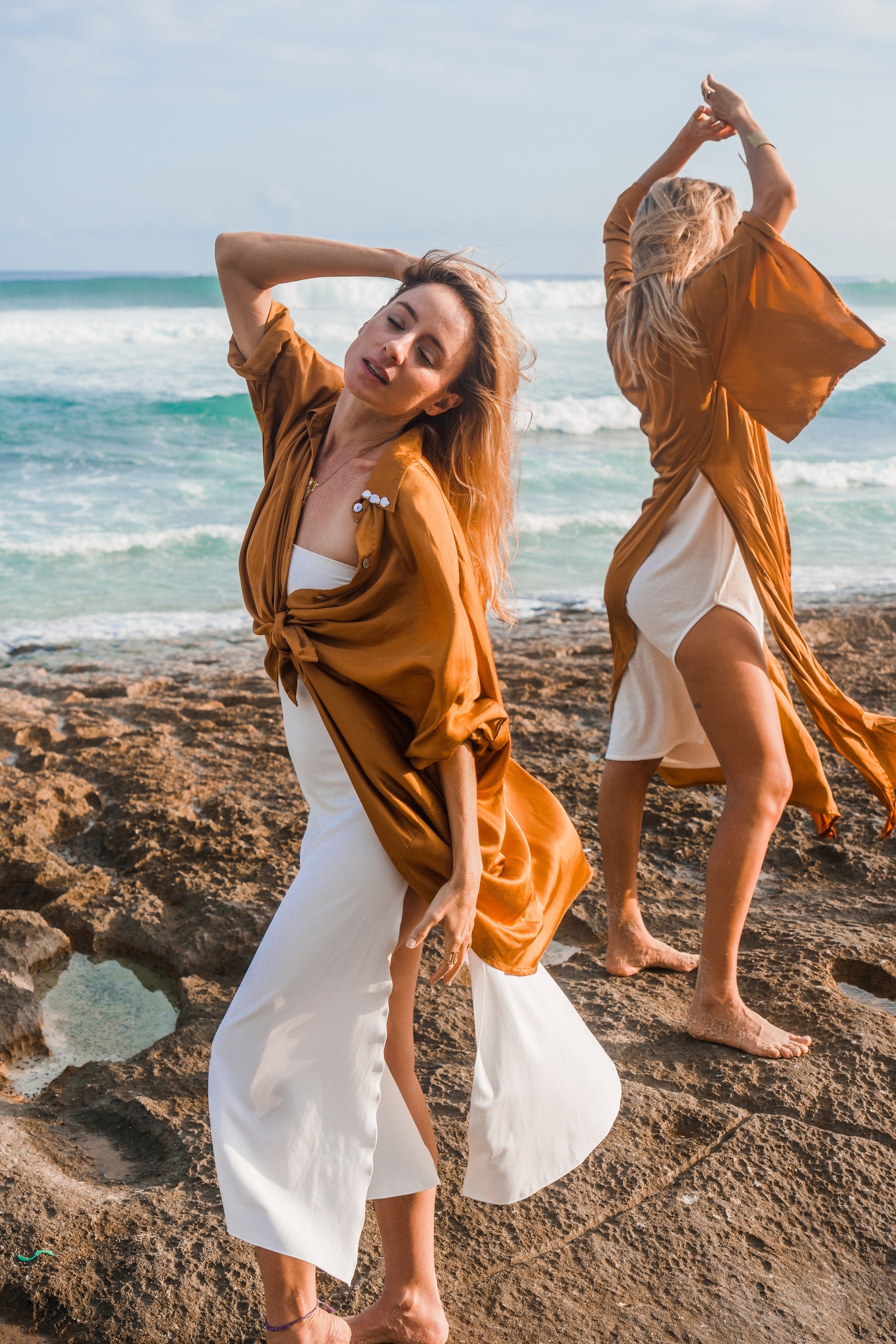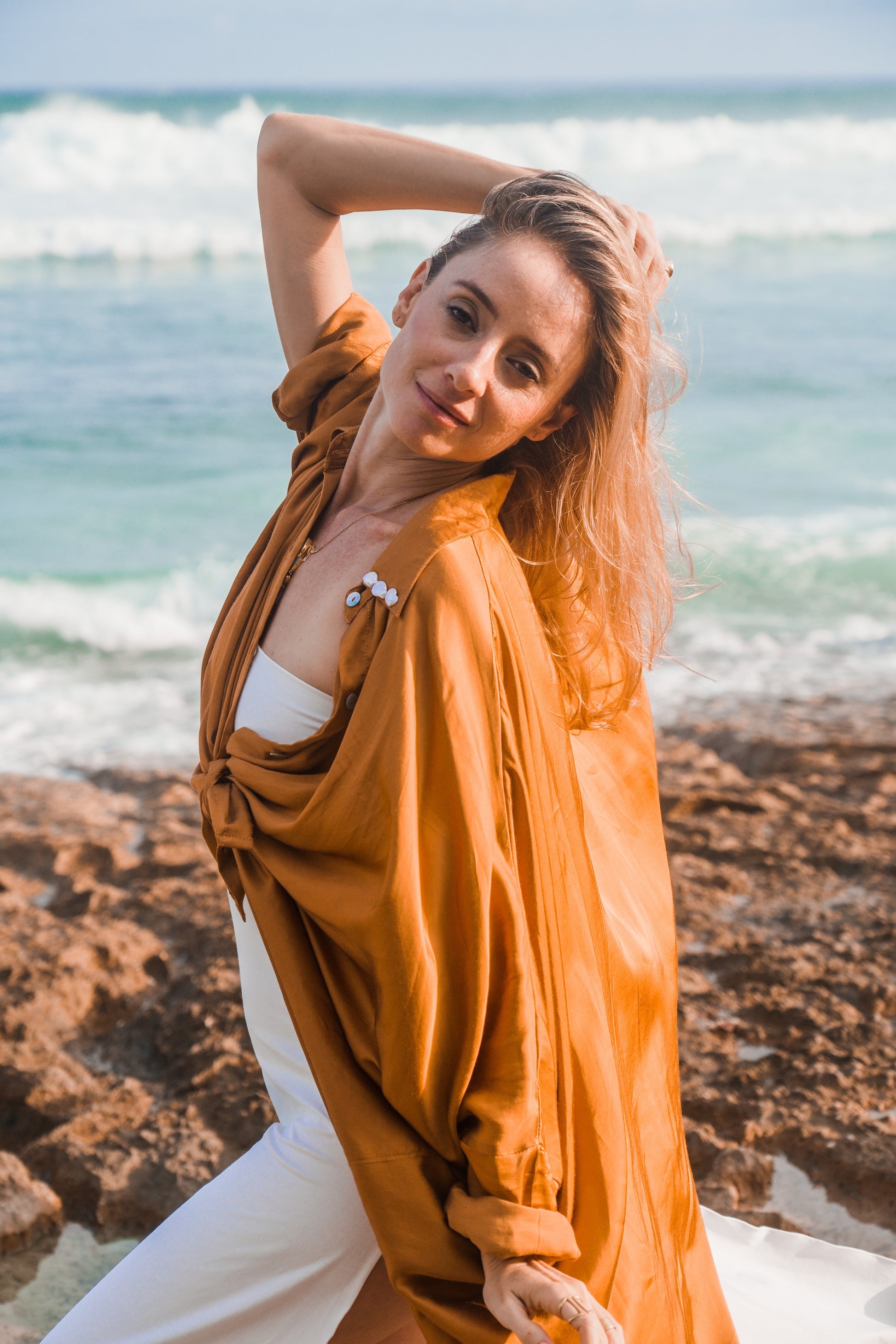 - Details: The blouse features a wide, flowing back and long sleeves that can be rolled up for a more casual look. It can be worn open or buttoned up partially, using beautiful shell buttons, or even tied in a knot for a stylish twist. The versatile design ensures it complements various styles and occasions.