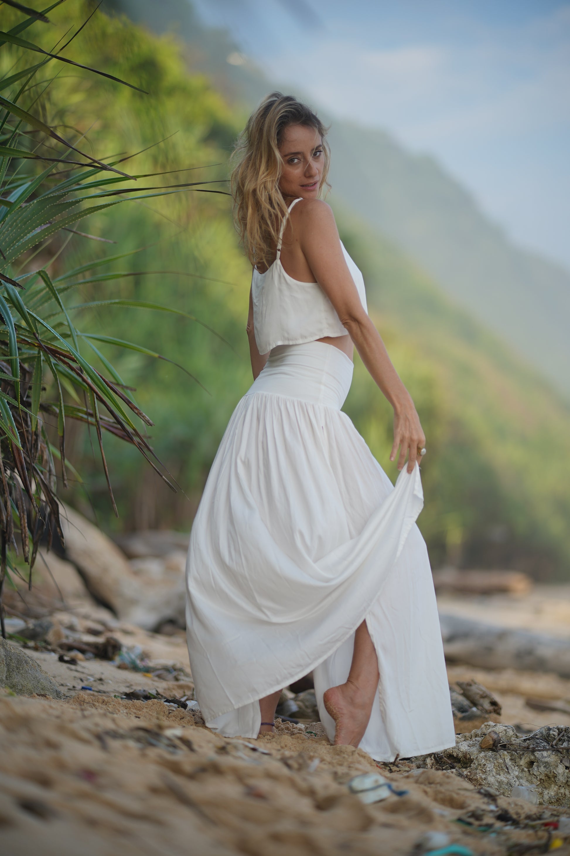 - Design: This stunning skirt is adorned with three exquisite pearls from Lombok, each symbolizing purity and elegance. The pearls add a touch of grace and uniqueness to the skirt. the design that adds a graceful and voluminous effect. The fabric is light and airy, enhancing its movement and drape.